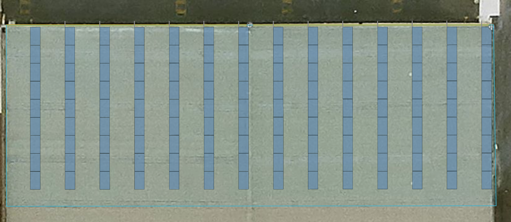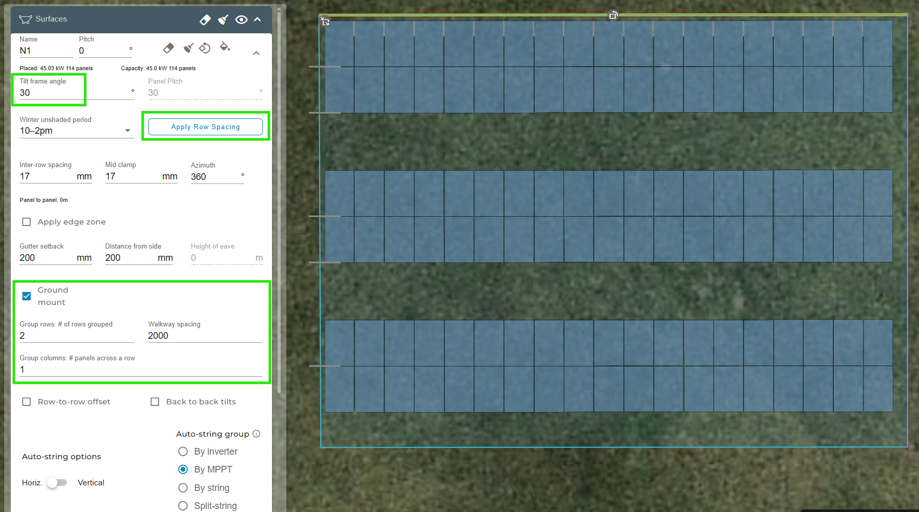 - To place horizontal gaps between groups of ground mounts, eg if there the frame is 9 panels wide, with a gap of 900mm between, then under Group columns, enter 9, with aisle spacing of 900