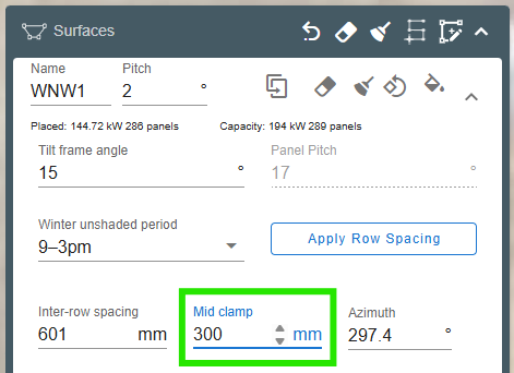 - Click Apply Row Spacing to calculate the optimal spacing to avoid shading (select the option of unshaded from 10am-2pm or 9am to 3pm). Alternatively, you can manually enter the Aisle spacing you want.