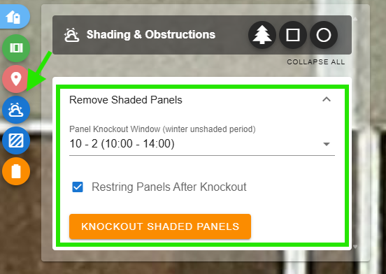 To use this feature, click the Shading & Obstructions icon on the left panel of the Map Design page, open the Panel Knockout window, and select Knockout Shaded Panels. This tool helps ensure your design includes only panels with optimal solar exposure.