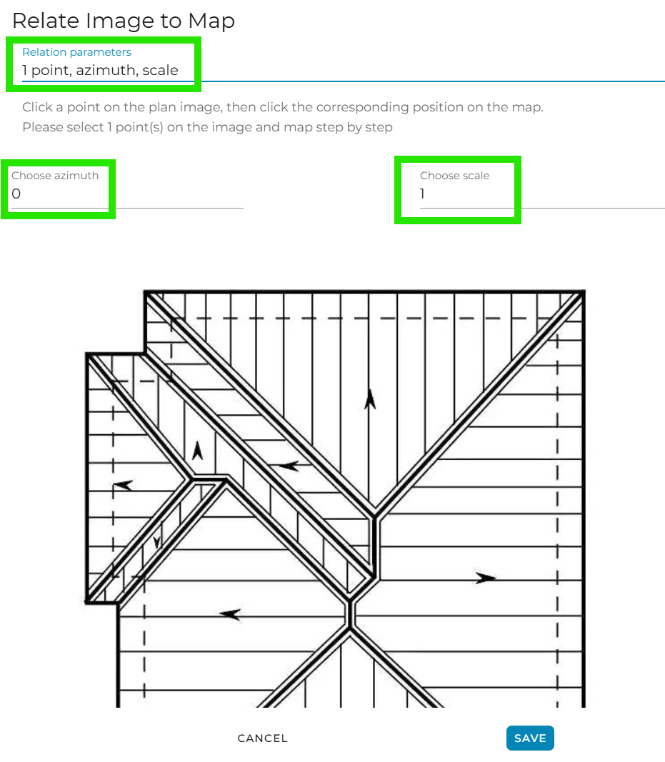 - Select points on the uploaded file (map/plan/site layout) and the corresponding point on the map.