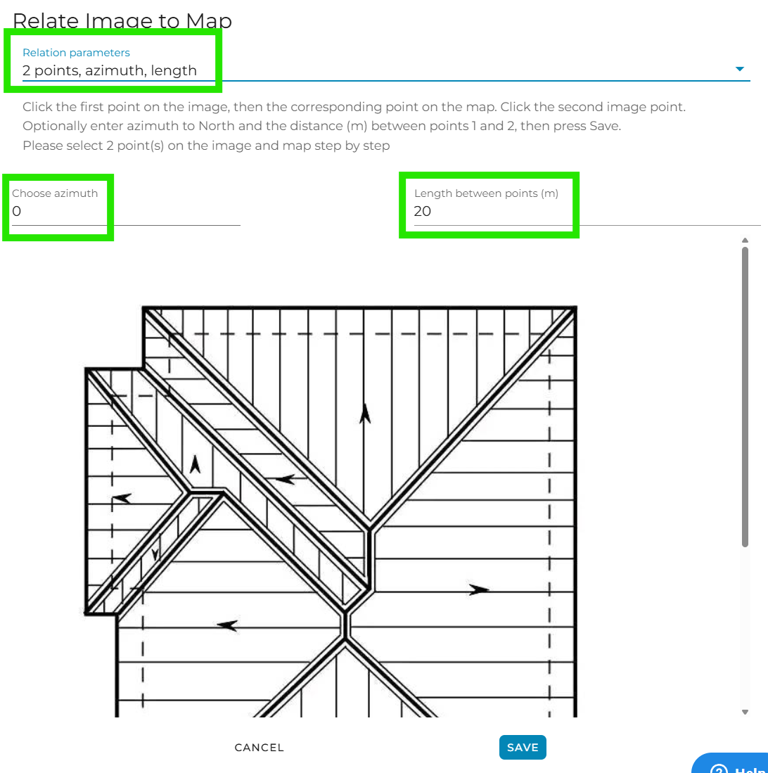 - Length Between points: On the plans/image, make note of a distance between 2 points. The longer it is the better, for example the length of the entire building. If using a drone image, you could use the length of the ladder on your van as a reference. Enter the length in meters.