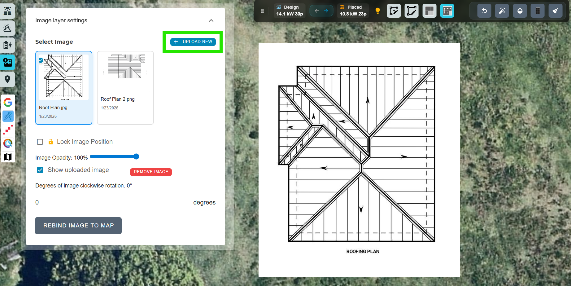 On the right, click “Upload New” and upload your image. This will add a new image to your design. Please note that only one image can be selected and viewed on the map at a time. -