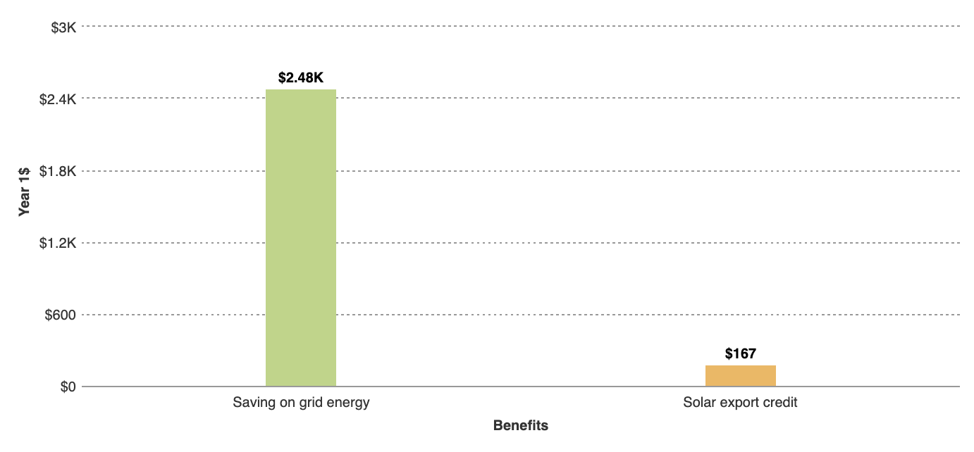 Benefit breakdown bar chart [benefit_breakdown] This chart shows the annual benefits from the proposed system, such as how much is saved by avoiding grid energy, earnings from solar export tariffs, and savings on demand charges (if applicable). If commercial, these values are ex. tax. |