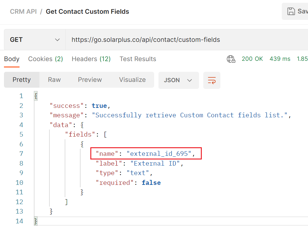 { "success": true, "message": "Successfully retrieve Custom Contact fields list.", "data": { "fields": [ { "name": "custom_text_12", "label": "Custom Text", "type": "text", "required": false }, { "name": "custom_select_13", "label": "Custom Select", "type": "select", "required": false, "options": [ { "value": "1", "label": "One" }, { "value": "Two", "label": "2" }, { "value": "Three", "label": "3" } ] } ] } }