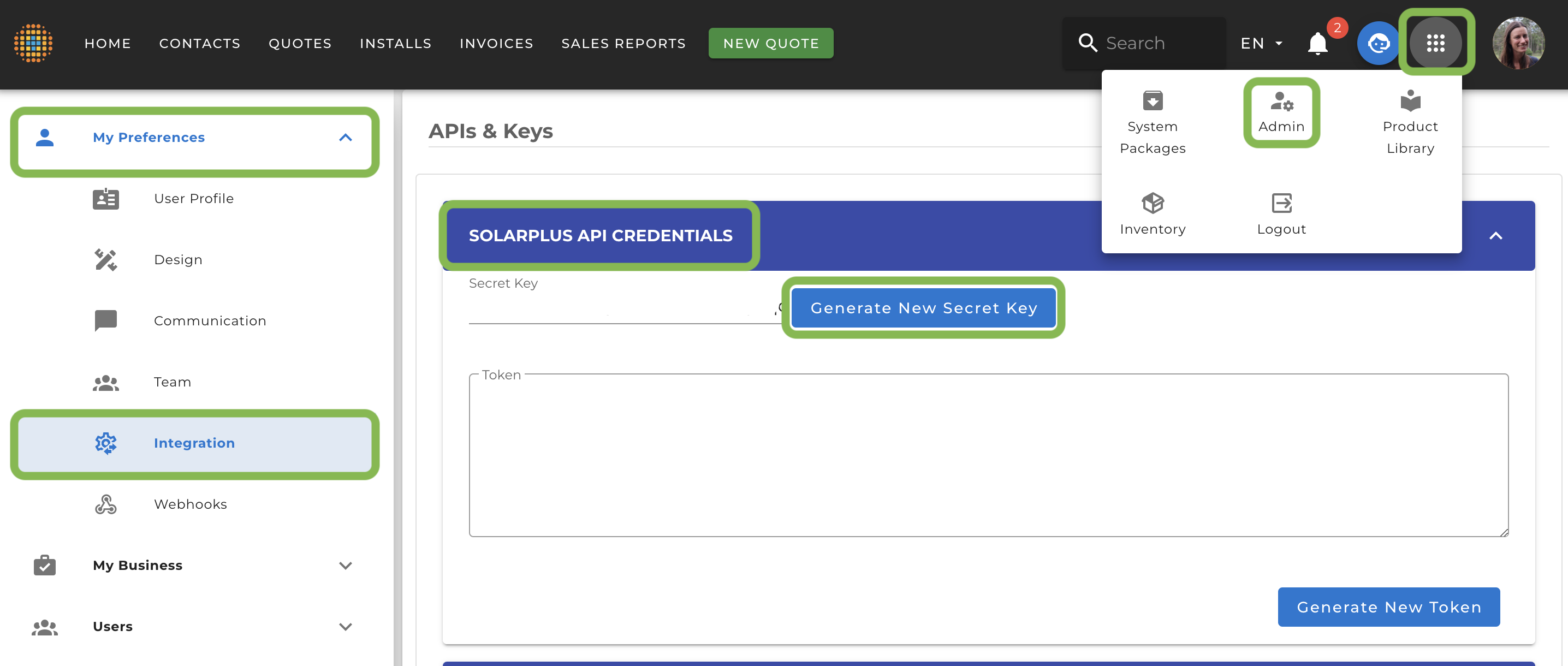 To generate go to https://go.solarplus.co/user/api , Click on the “Generate new Secret Key” button and after that click “Generate new Token” button.