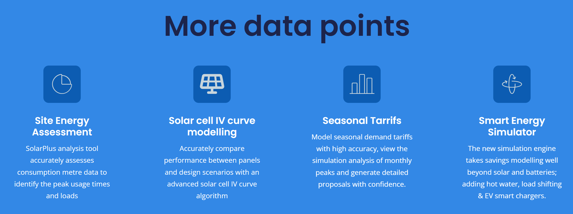 In 2017, SolarPlus introduced an advanced performance algorithm which provides best-in-class modelling across a broad range of design configuration options including grid-connect, hybrid/backup battery storage, off-grid, system upgrades and supporting a wide range of load profile and tariff analysis options.