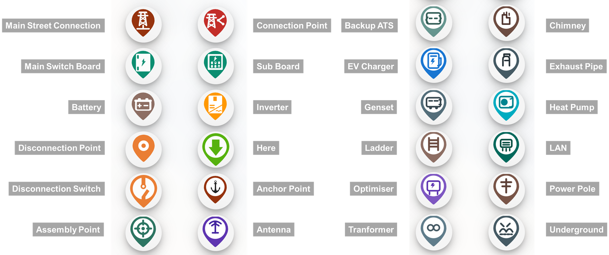 A Solar Site Plan is a bird's-eye view of a property that identifies where all system components will be physically installed. Map Markers act as precise digital anchors on this plan, pinpointing the location of essential hardware such as the Inverter (INV), Battery (BATT), and Main Switchboard (MSB).